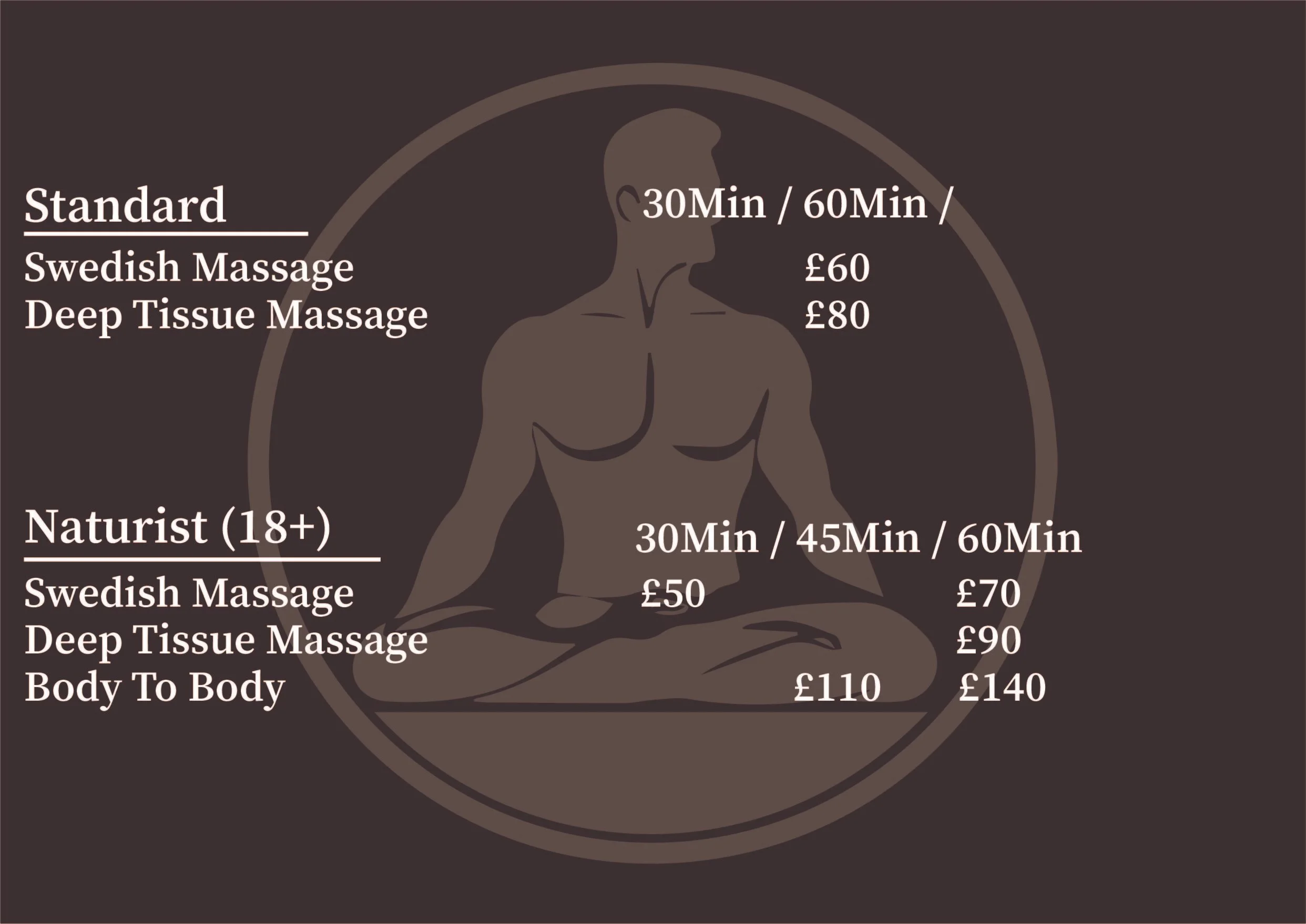 We are currently offering the 5 main massages due to only just getting back to Manchester. More will be available soon!